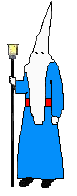 Capuz y guantes blancos, fajín rojo, túnica azul celeste. |