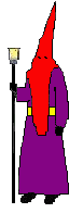 Capuz rojo. Túnica morada. Guantes negros. Fajín amarillo. |