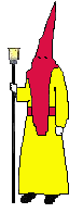 Capuz y fajín granate. Túnica amarilla. Guantes blancos. |